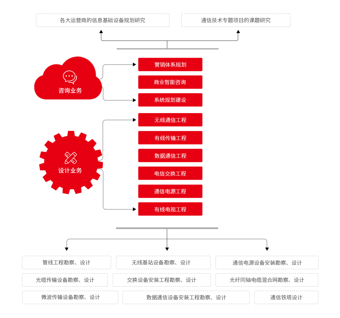 為客戶提供通信網(wǎng)、計(jì)算機(jī)網(wǎng)、廣播電視網(wǎng)等網(wǎng)絡(luò)的設(shè)計(jì)咨詢服務(wù);為通信企業(yè)提供綜合發(fā)展規(guī)劃、戰(zhàn)略規(guī)劃 專題規(guī)劃、業(yè)務(wù)咨詢及管理咨詢等咨詢服務(wù)。公司擁有工程設(shè)計(jì)、工程勘察等國內(nèi)通信設(shè)計(jì)領(lǐng)域的頂級(jí)資質(zhì);優(yōu)質(zhì)的服務(wù)質(zhì)量,快速的業(yè)務(wù)響應(yīng)能力、標(biāo)準(zhǔn)化、規(guī)范化的服務(wù)流程以及優(yōu)秀的工程設(shè)計(jì)項(xiàng)目質(zhì)量為公司在業(yè)界取得良好的口碑。
